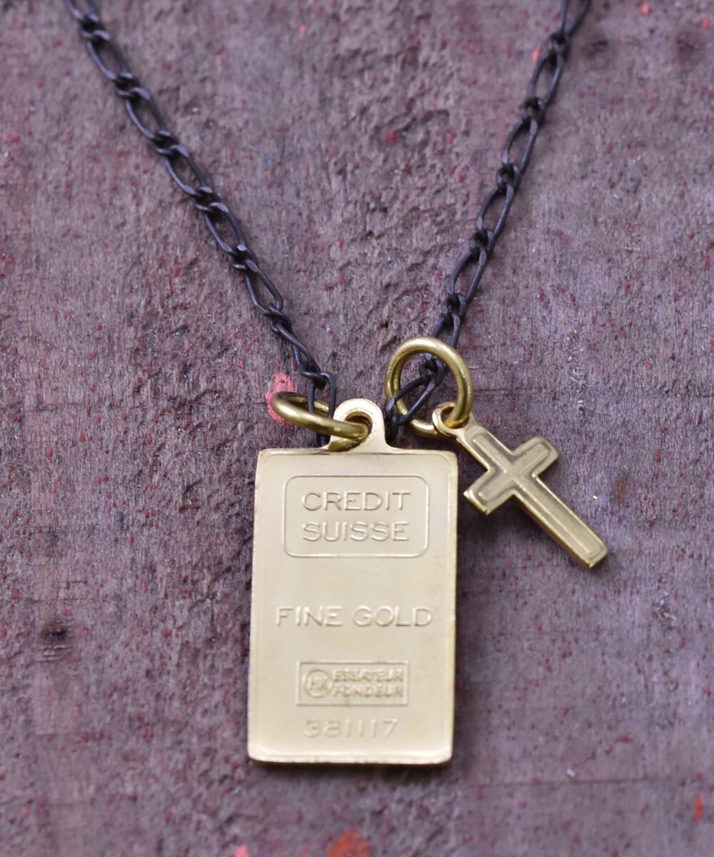 エリザベス2世のインゴットをモチーフにした真鍮製のトップとクロスを組み合わせたネックレス。
