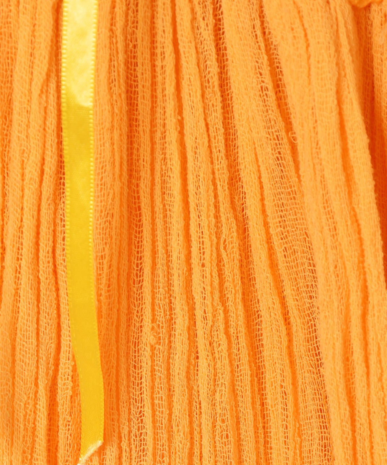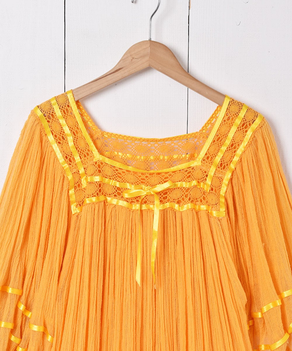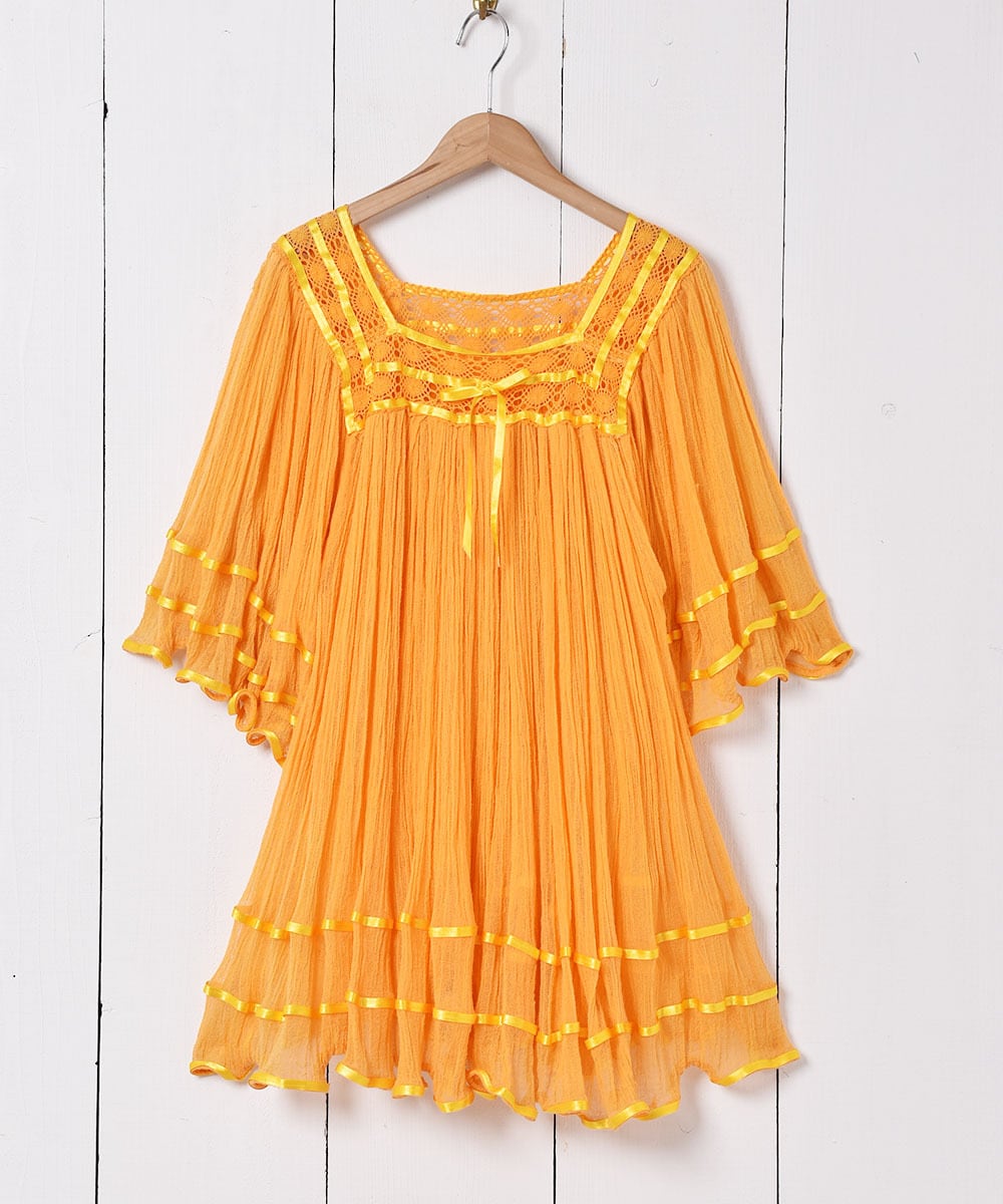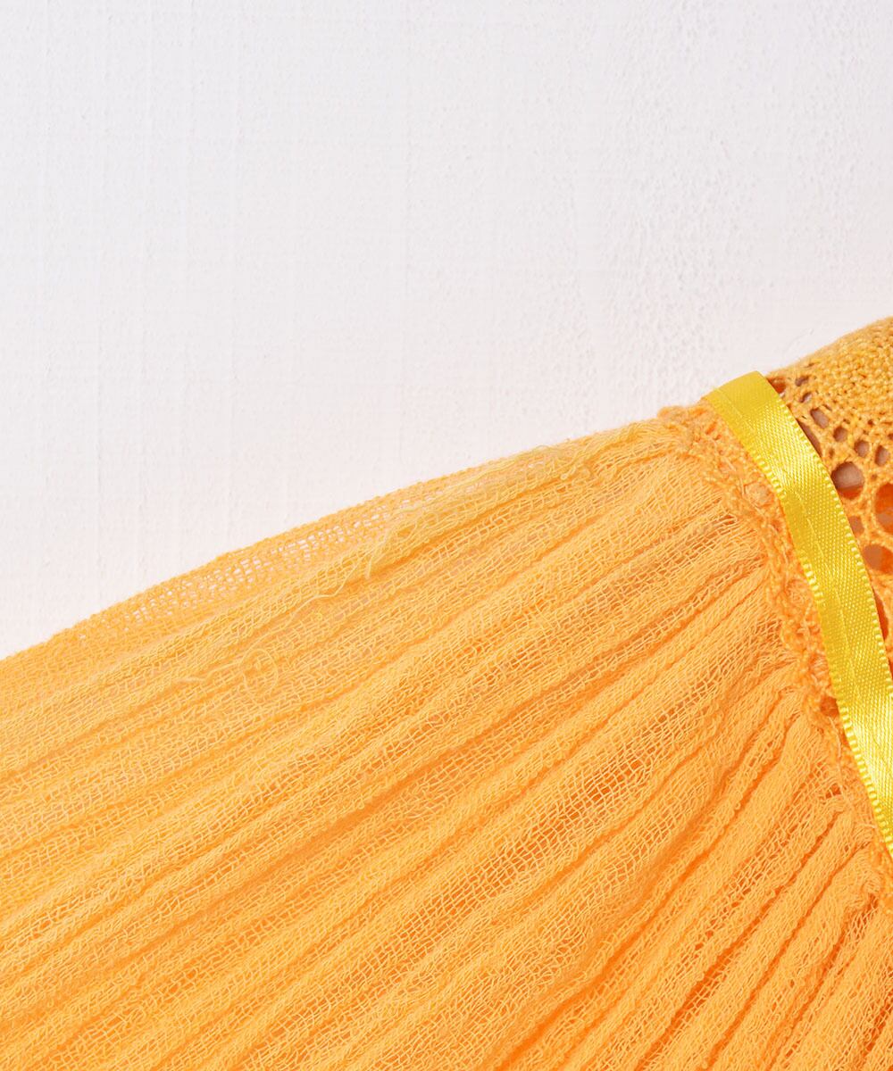 コットンガーゼの柔らかな肌触りが心地よいギリシャワンピース。イエローとオレンジの中間のような色味もポイント。ふわっとボリューム感のあるシルエットで、暑い季節でも着心地のよい一着です。