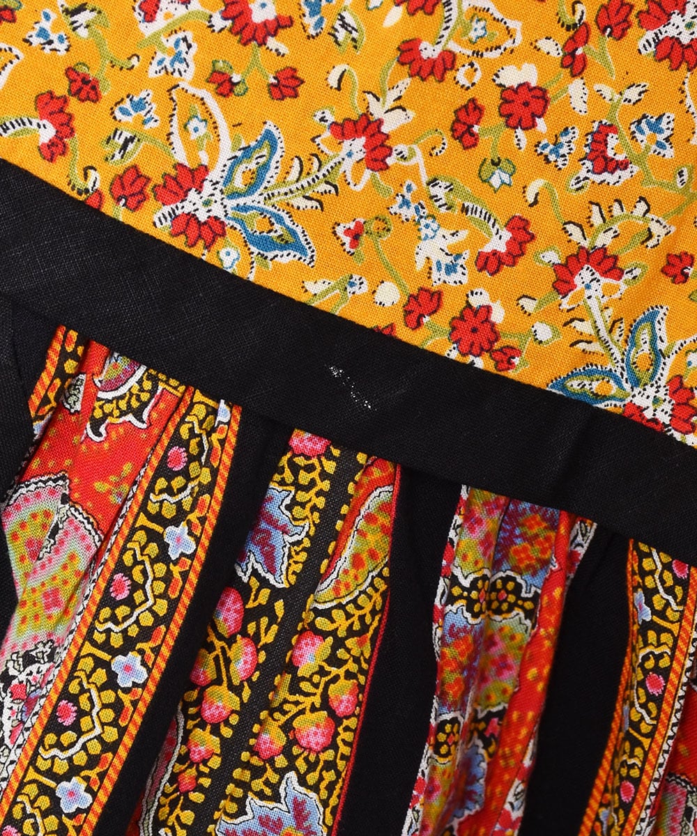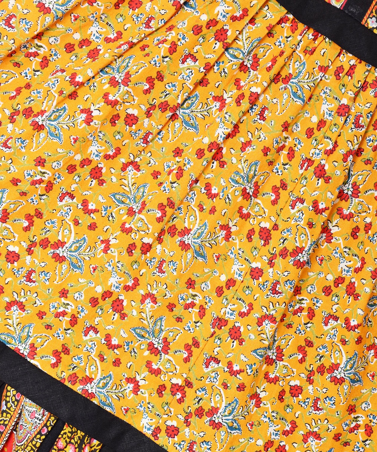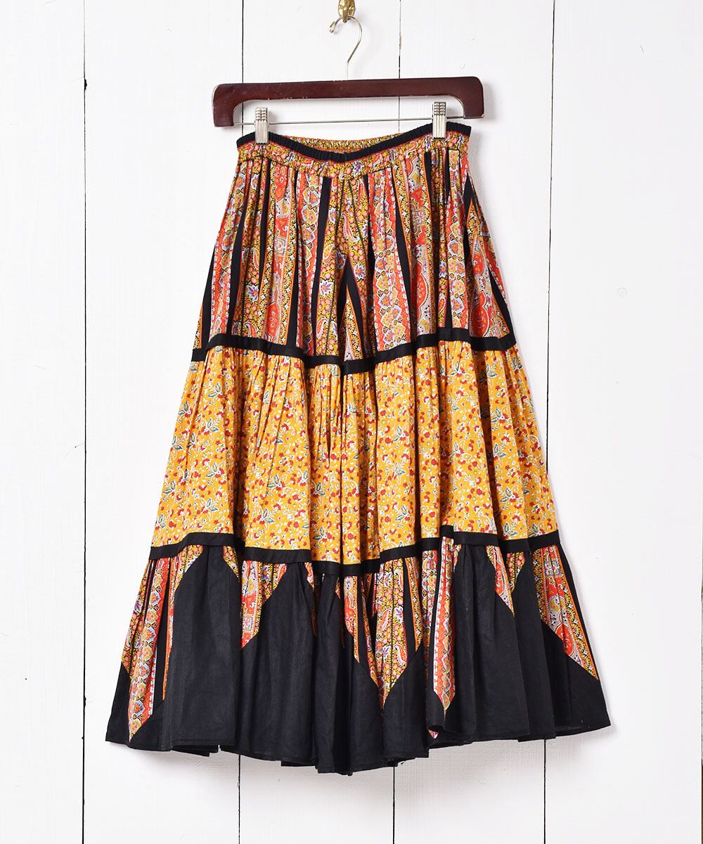ボリューミーなシルエットが華やかさ満点のフレアスカート。三種類の柄生地を組み合わせたデザインが魅力。おそらくコットン素材で、薄手でハリのある生地感です。