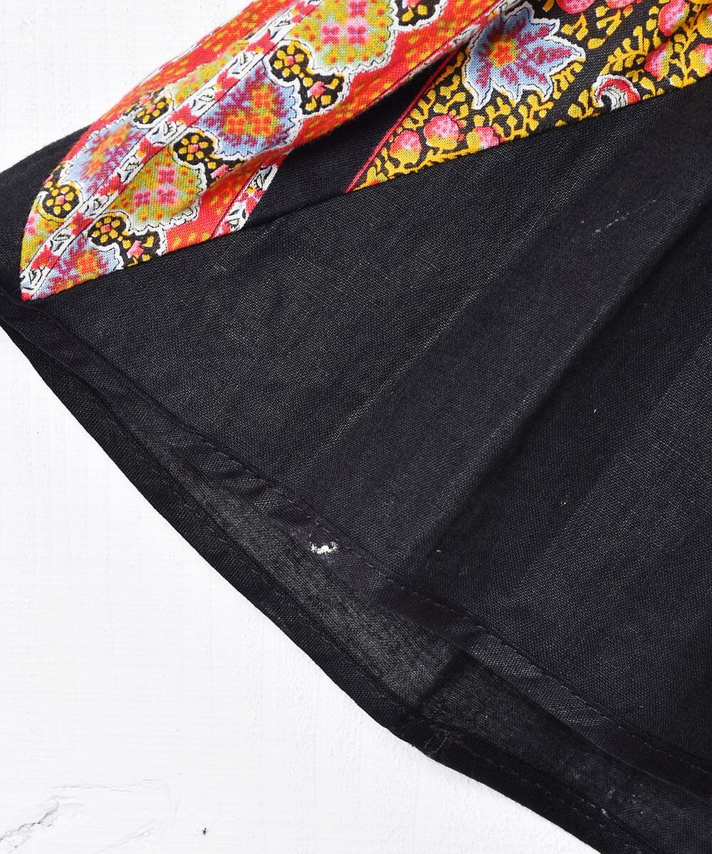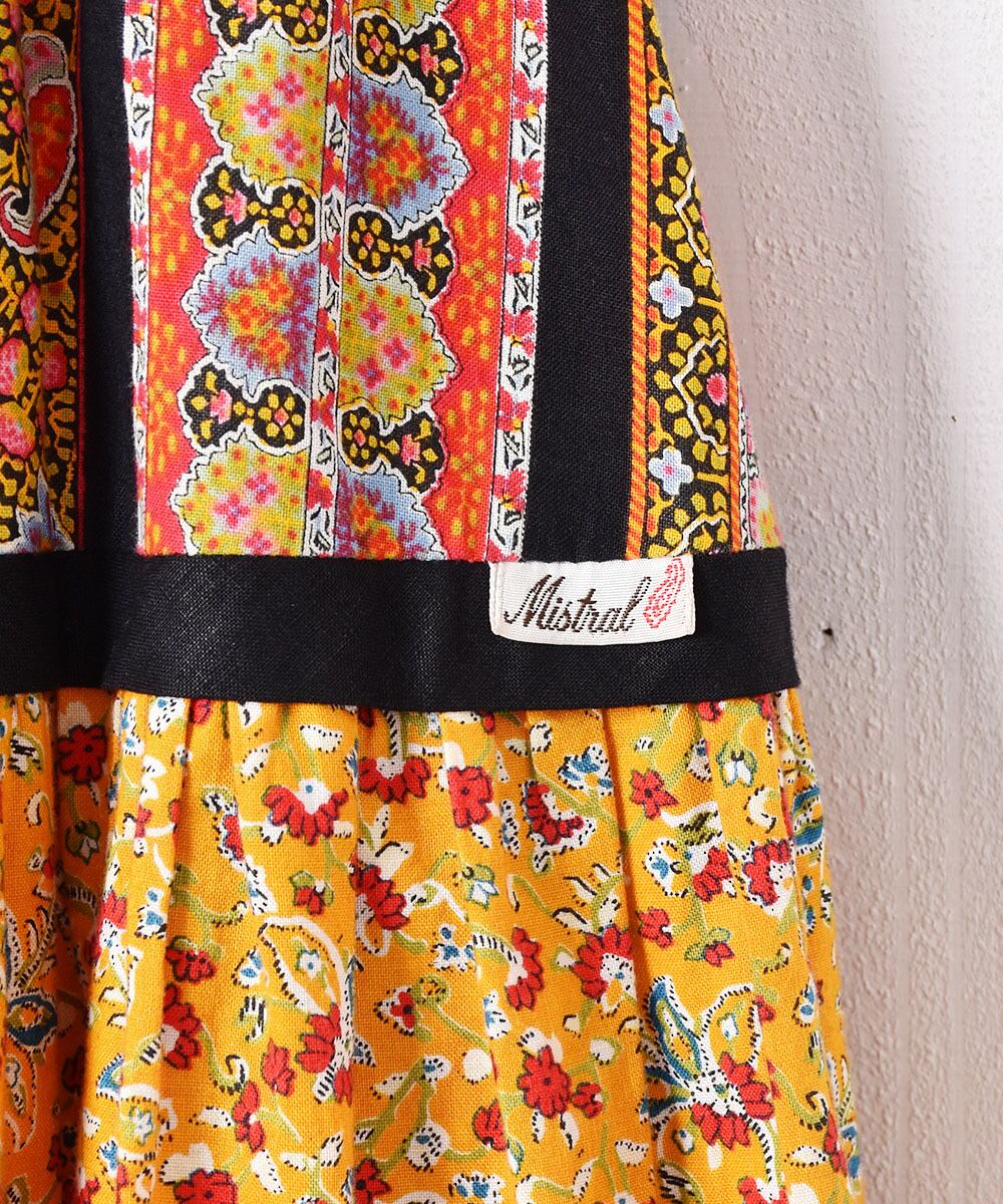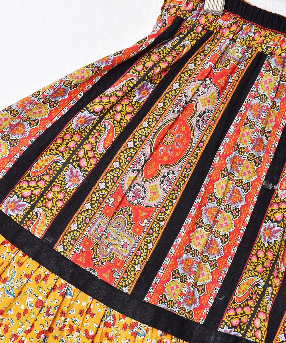 ボリューミーなシルエットが華やかさ満点のフレアスカート。三種類の柄生地を組み合わせたデザインが魅力。おそらくコットン素材で、薄手でハリのある生地感です。