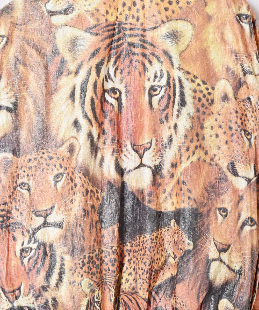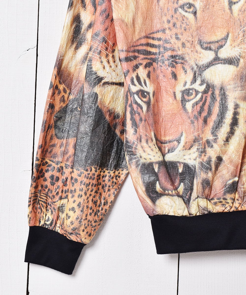 大胆な総柄が目を惹くペーパージャケット。名前の通り紙のように軽く、薄手の生地です。