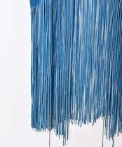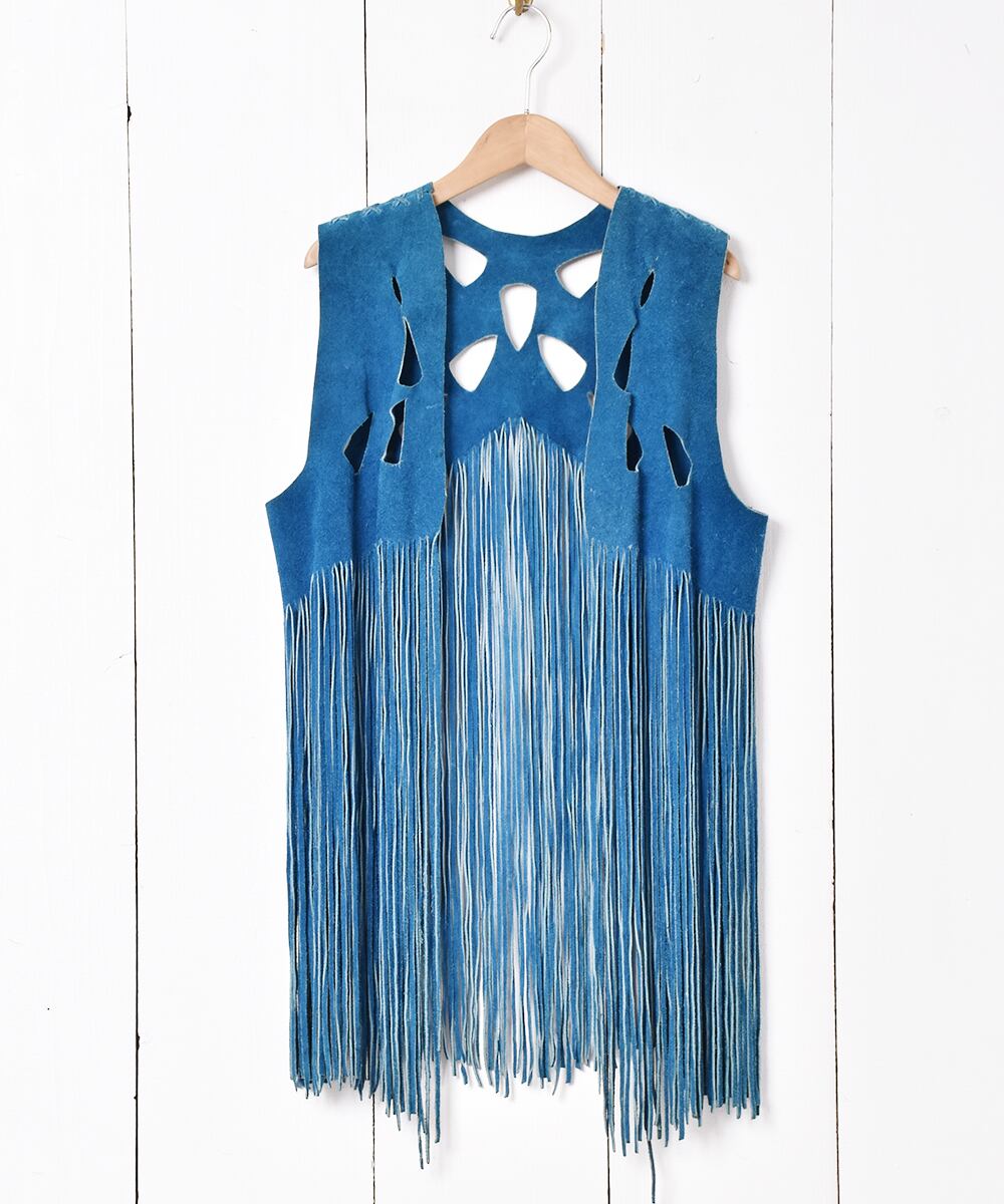 渋みのあるブルーが雰囲気満点のスエードベスト。長めのフリンジやトライアングルのくり抜きデザインなどデザイン性の高い一着。重量感のある、しっとりとしたスエード生地です。