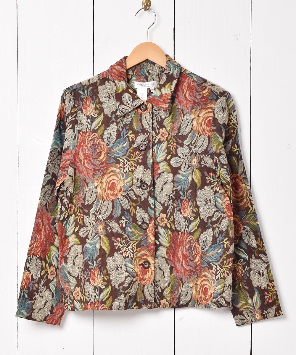 可憐な大花が一面に広がった総柄ジャケット。上品な雰囲気ながらもカジュアルな形なので、コーディネートの幅が広がりそう。裏地はなく、しっかりとした生地感です。