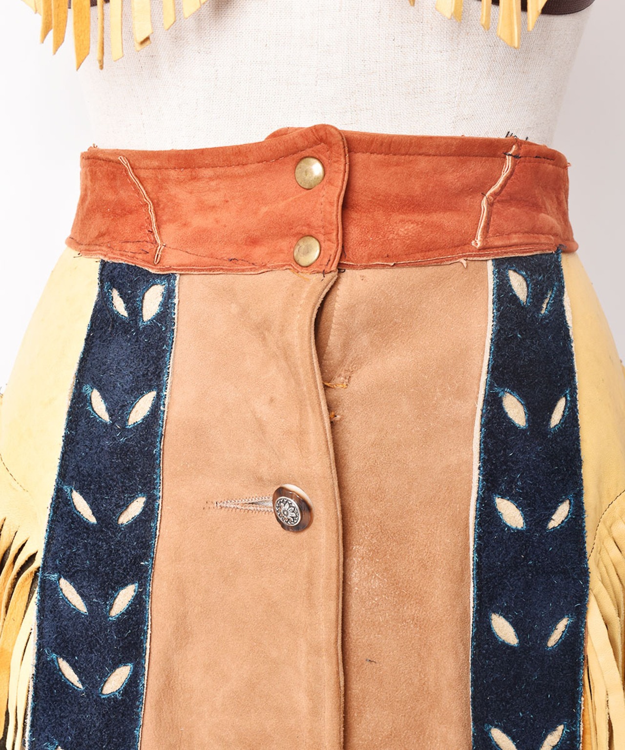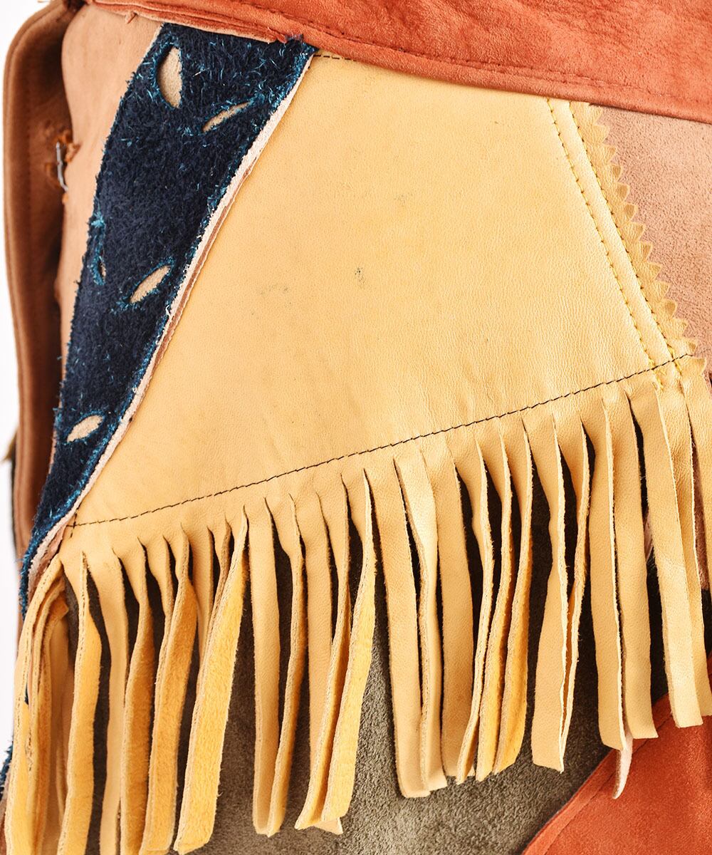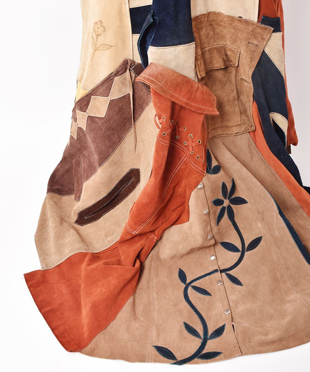 レザーのパッチワークデザインがクールかつ大胆なセットアップ。リメイク商品で、世界にひとつだけのスペシャルな一点。存在感と重みを感じられる生地感です。