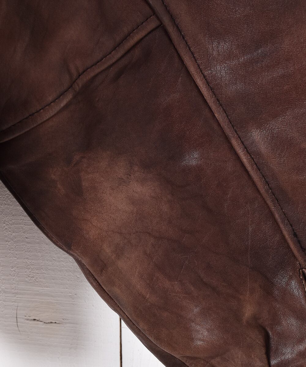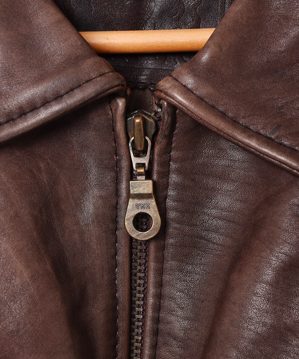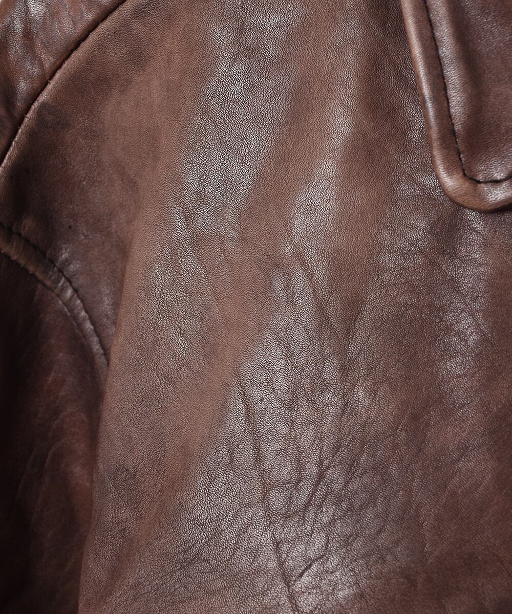 雰囲気のよいブラウンの羊皮ジャケット。裏地付きで手触りがよく、重厚感のあるレザー生地です。