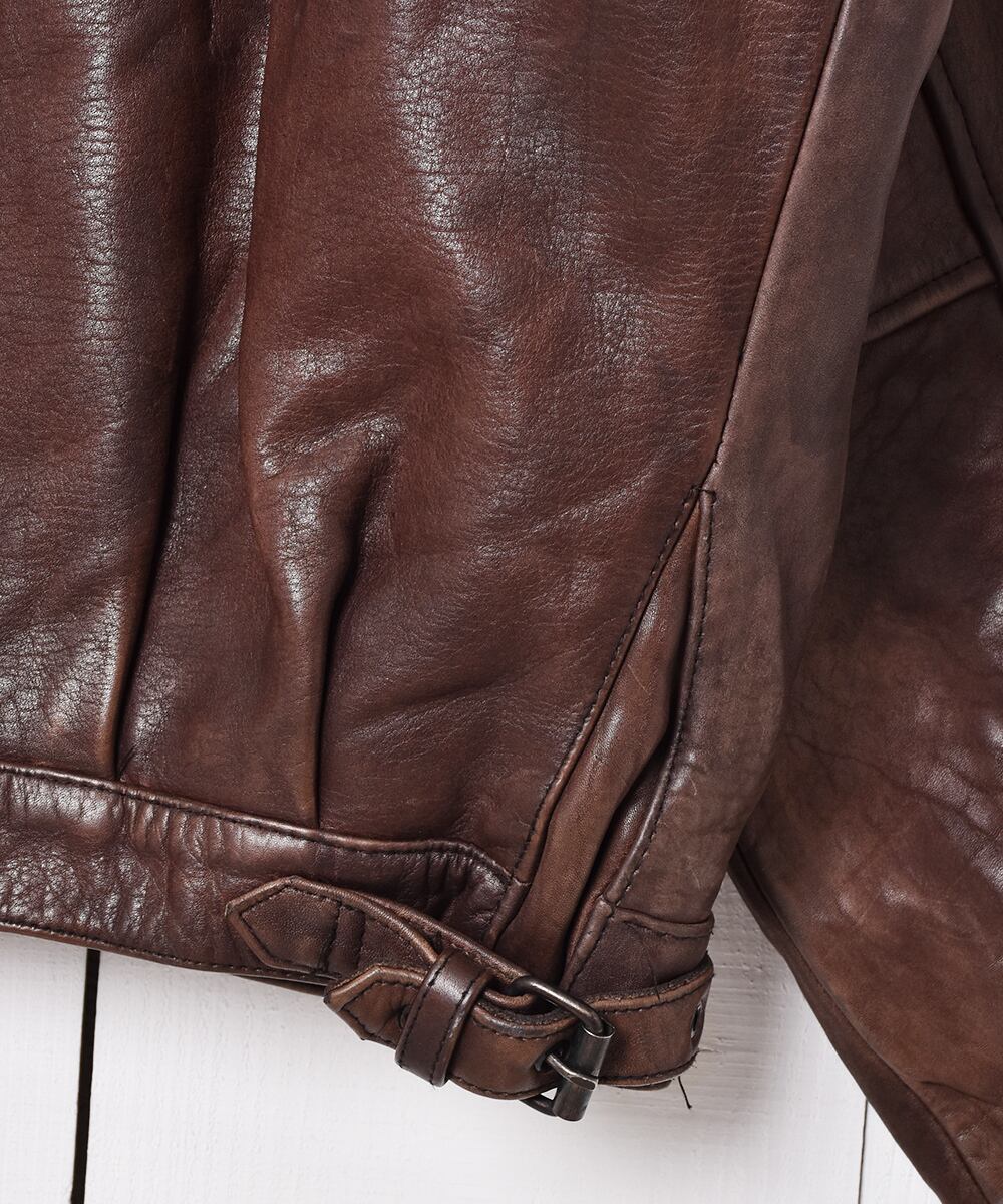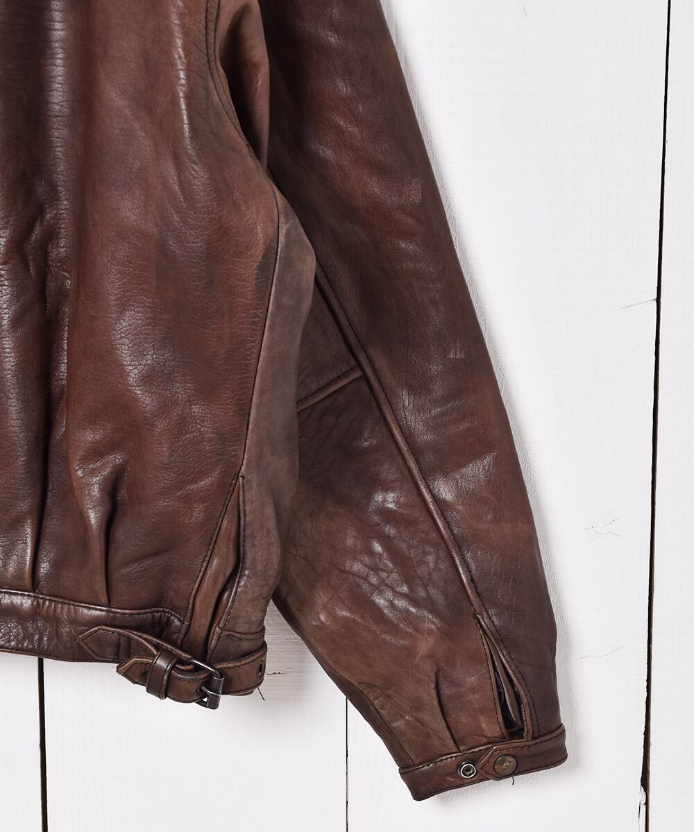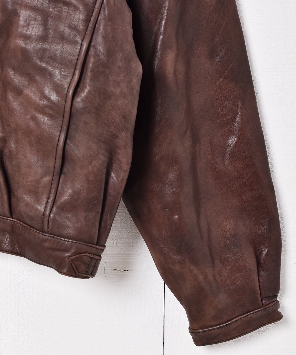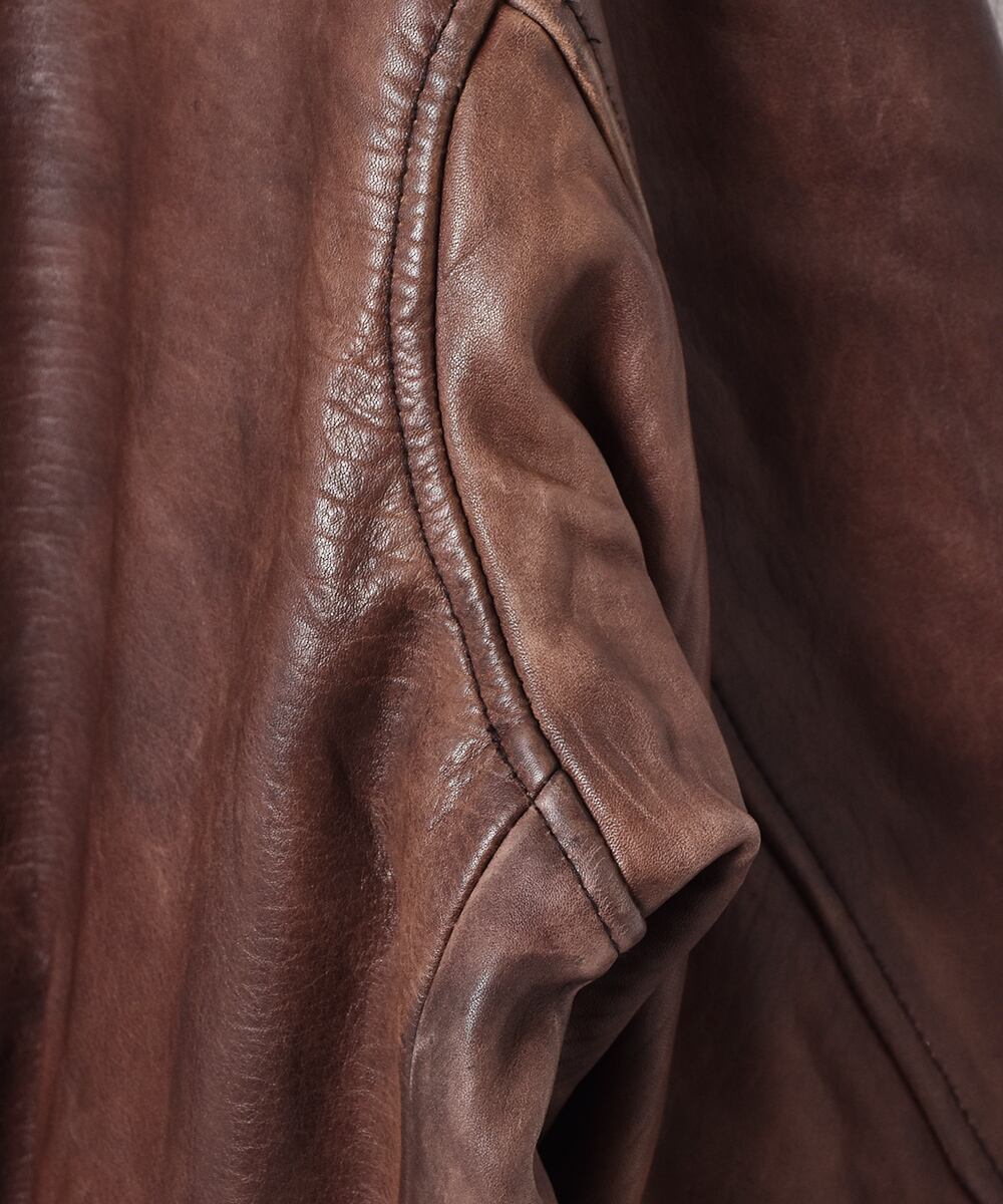 雰囲気のよいブラウンの羊皮ジャケット。裏地付きで手触りがよく、重厚感のあるレザー生地です。