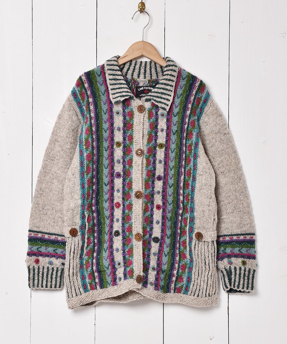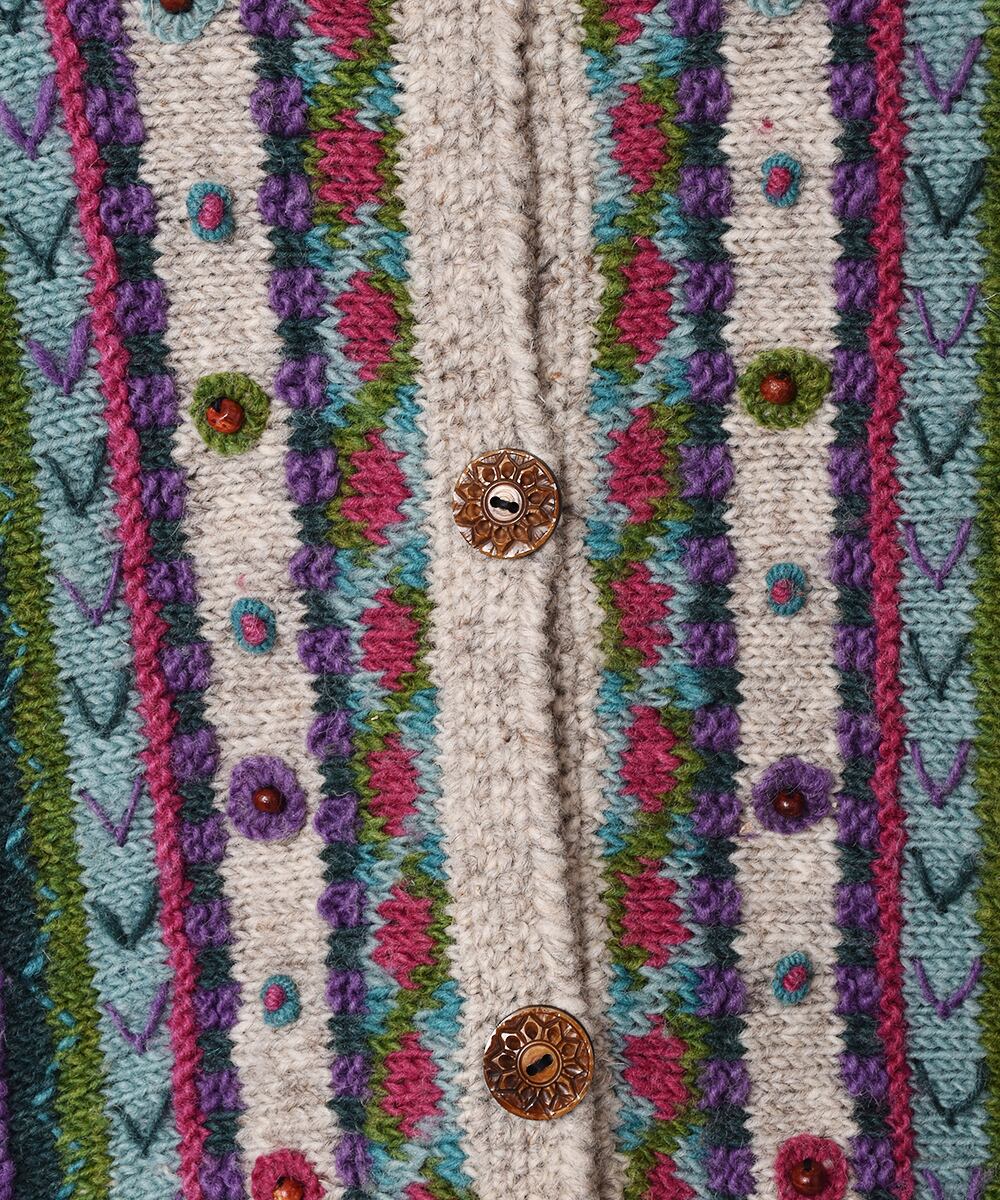 ウッドビーズをあしらったデザインが目を惹く襟付きカーディガン。厚みのある、ざっくりとしたニット地です。