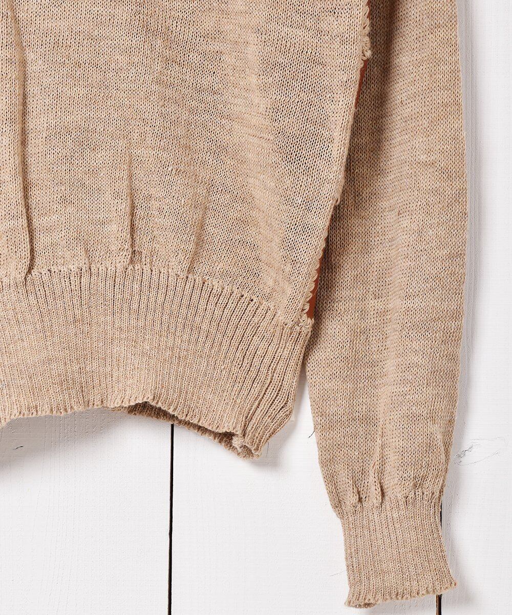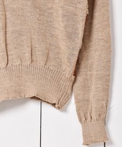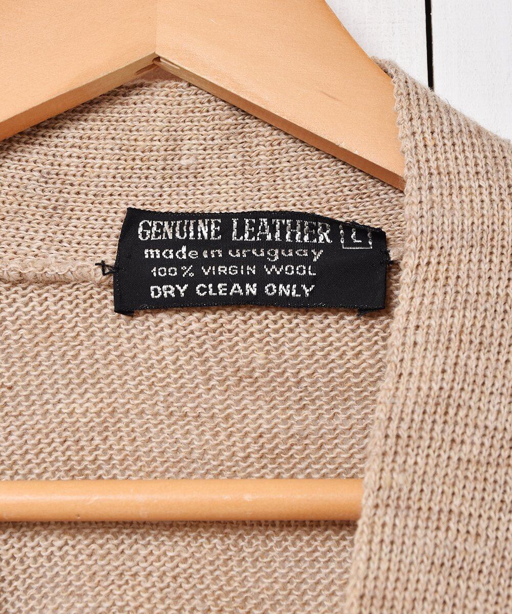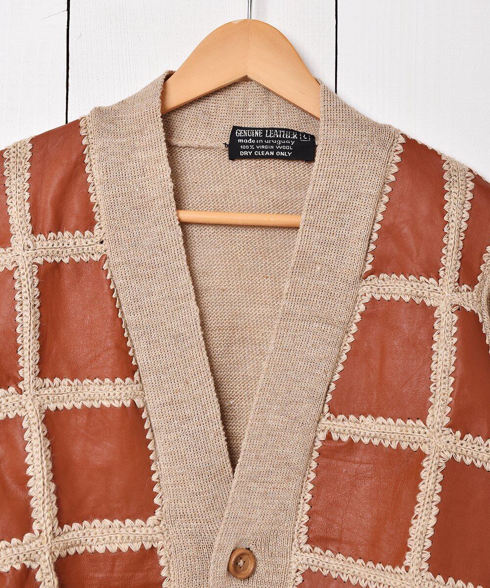 レザーのパッチワークデザインが目を惹くレトロなカーディガン。ボディは薄手のウールニットで、羽織やすい一着です。