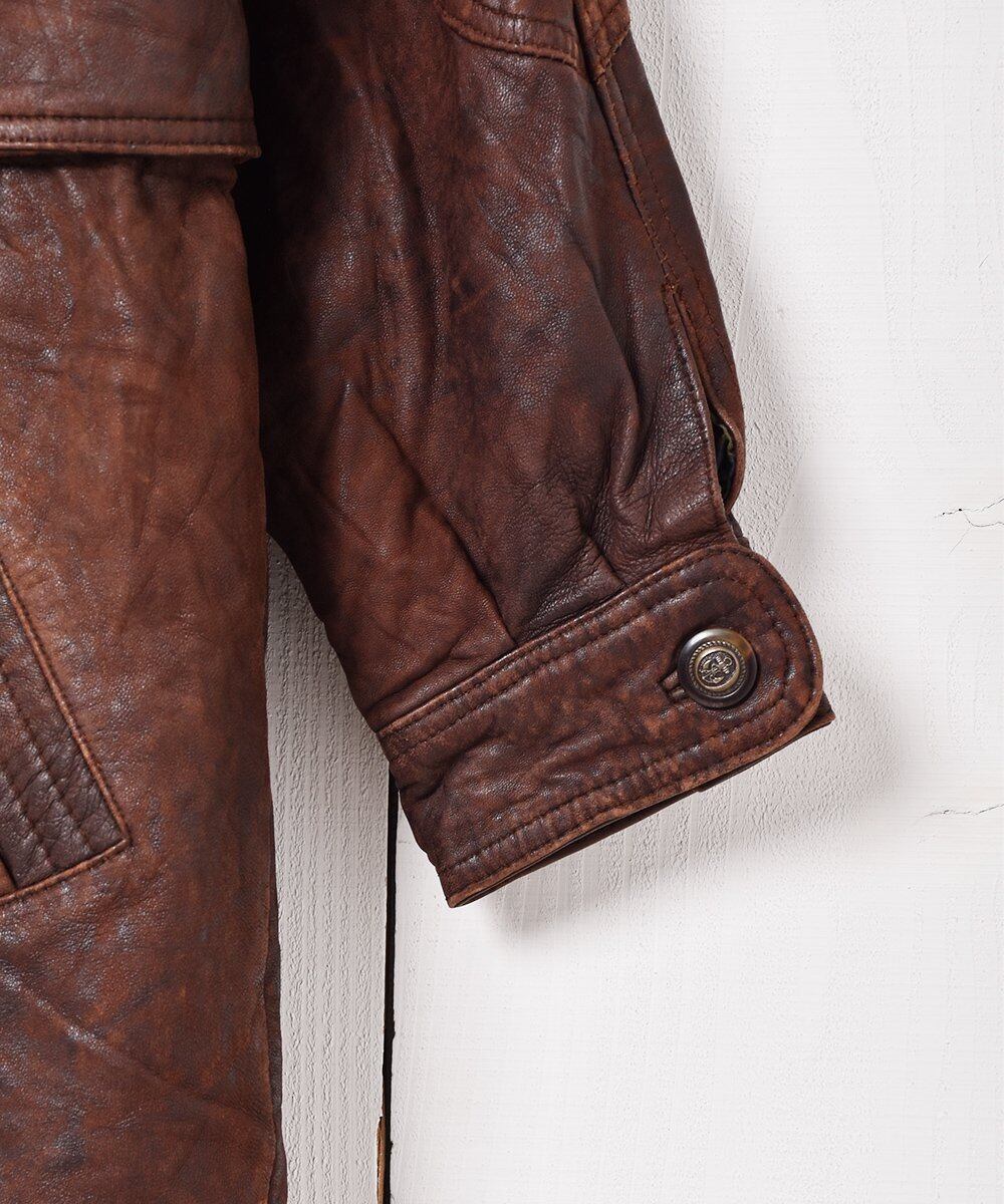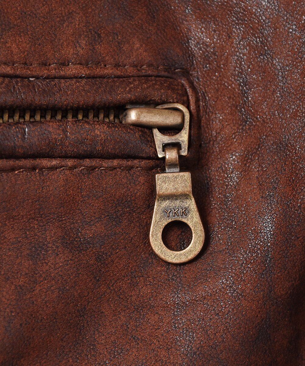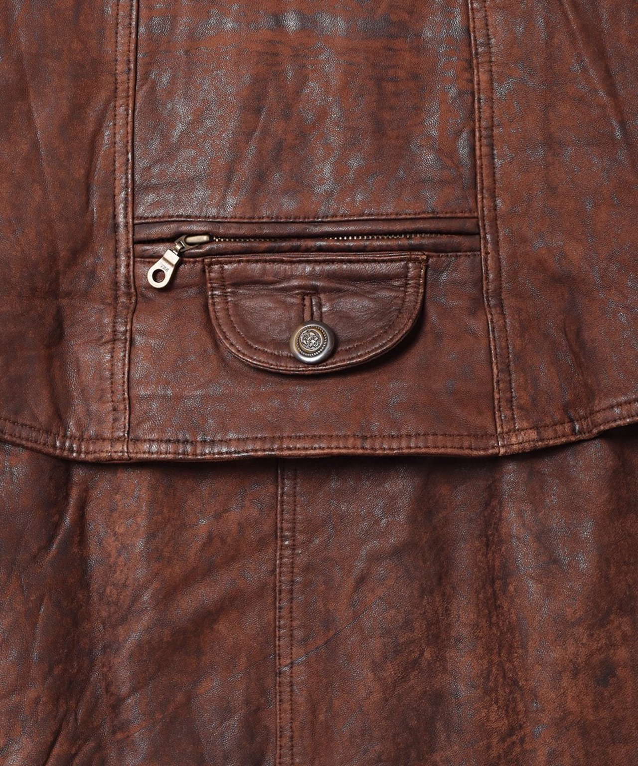 色ムラのあるレザーが雰囲気のよいレザージャケット。バックにもポケットが付いていたり、ボタンなど遊びの効いたデザインがポイント。柄裏地付きで、しっかりとあたたかい一着です。