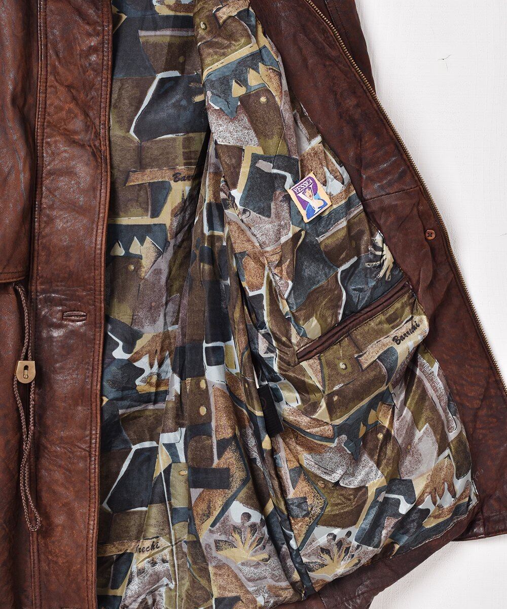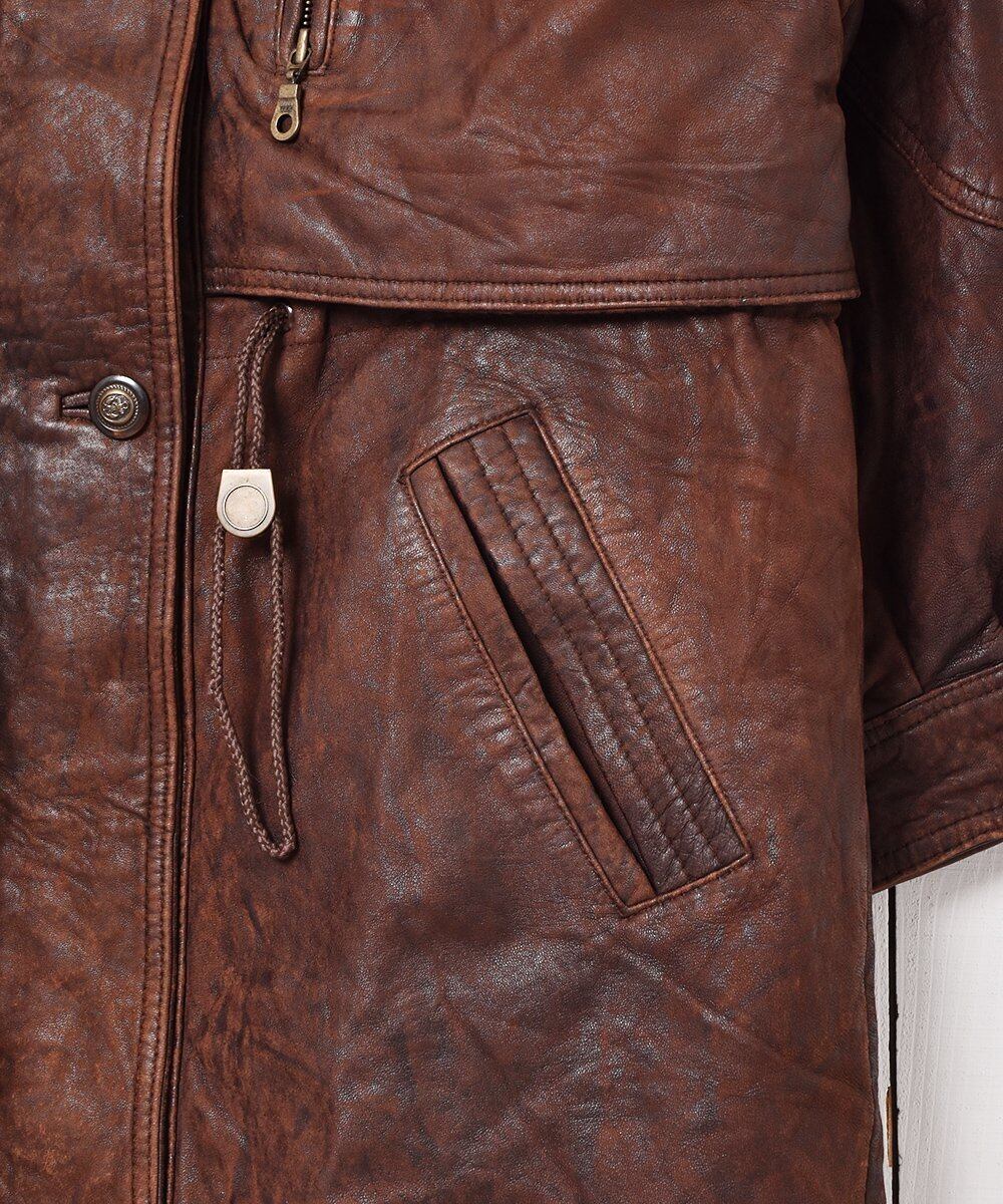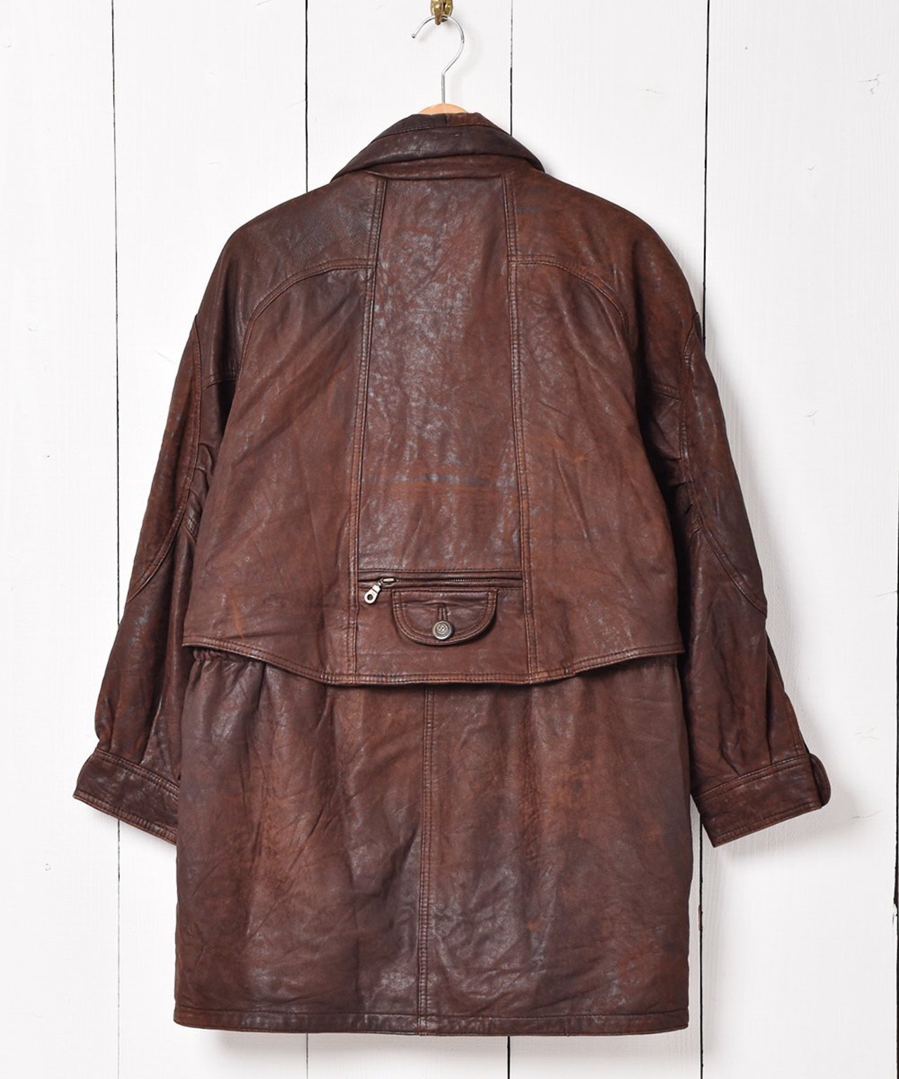 色ムラのあるレザーが雰囲気のよいレザージャケット。バックにもポケットが付いていたり、ボタンなど遊びの効いたデザインがポイント。柄裏地付きで、しっかりとあたたかい一着です。