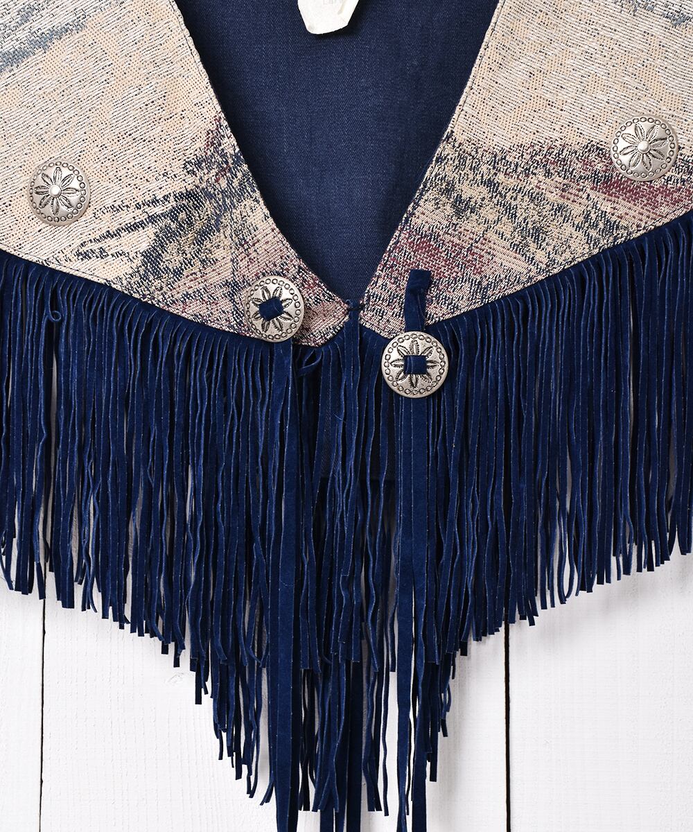 フリンジやコンチョボタンなどがあしらわれ、古着らしい雰囲気満点の一着。コーディネートのアクセントにお使いいただけます。