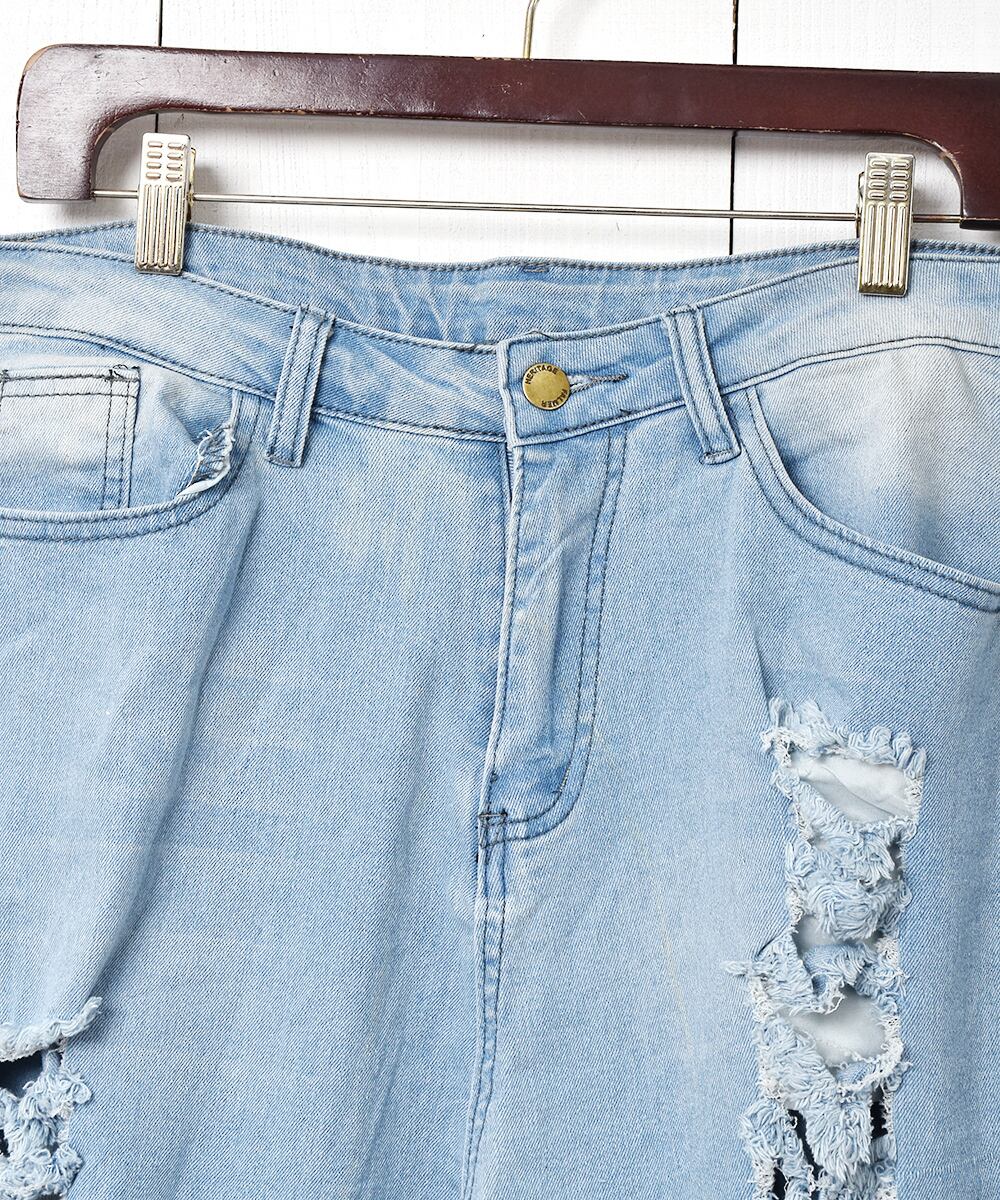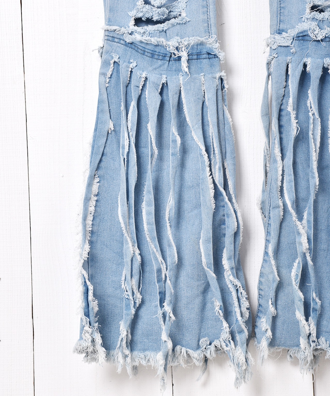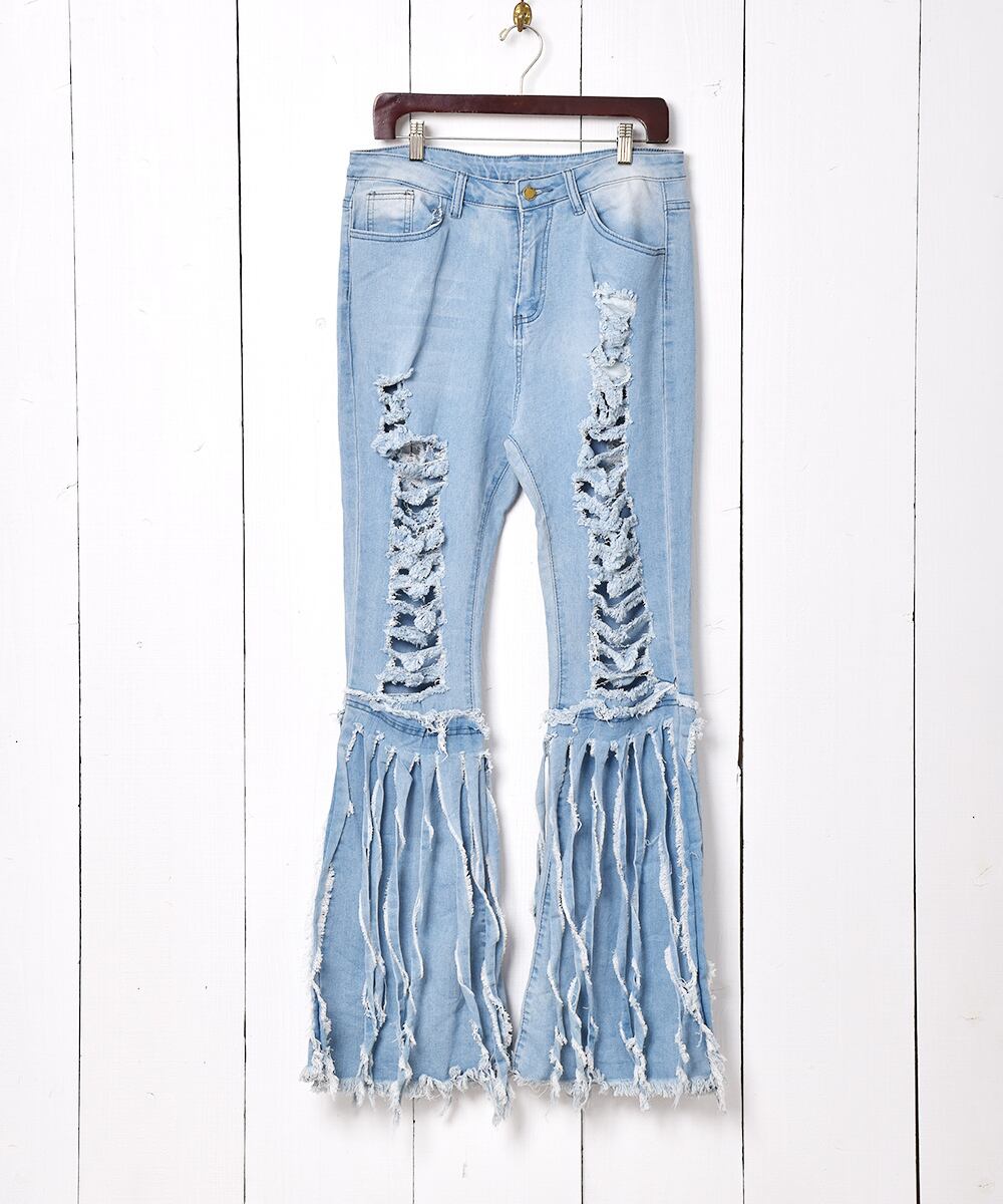 大胆なダメージ加工と裾のフリンジがインパクト抜群のデニムパンツ。フレアシルエットなので、スタイルよく着こなせる一着です。