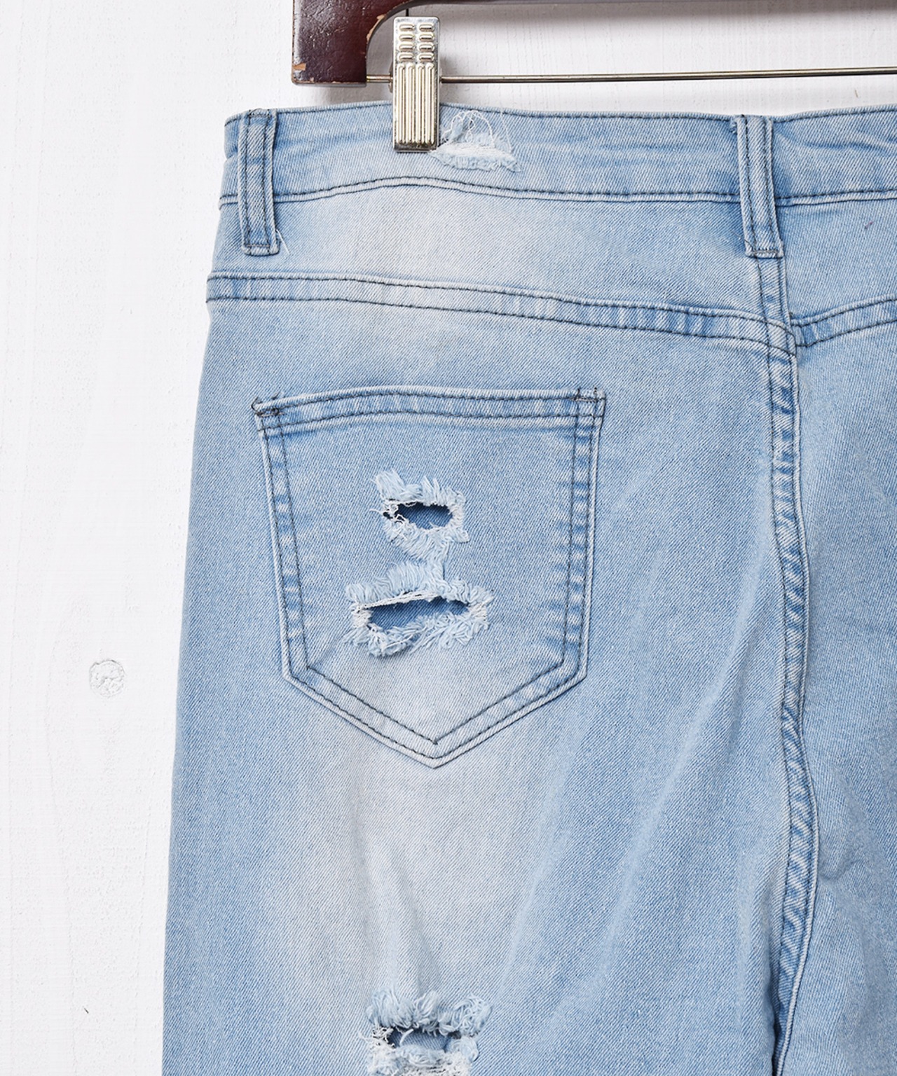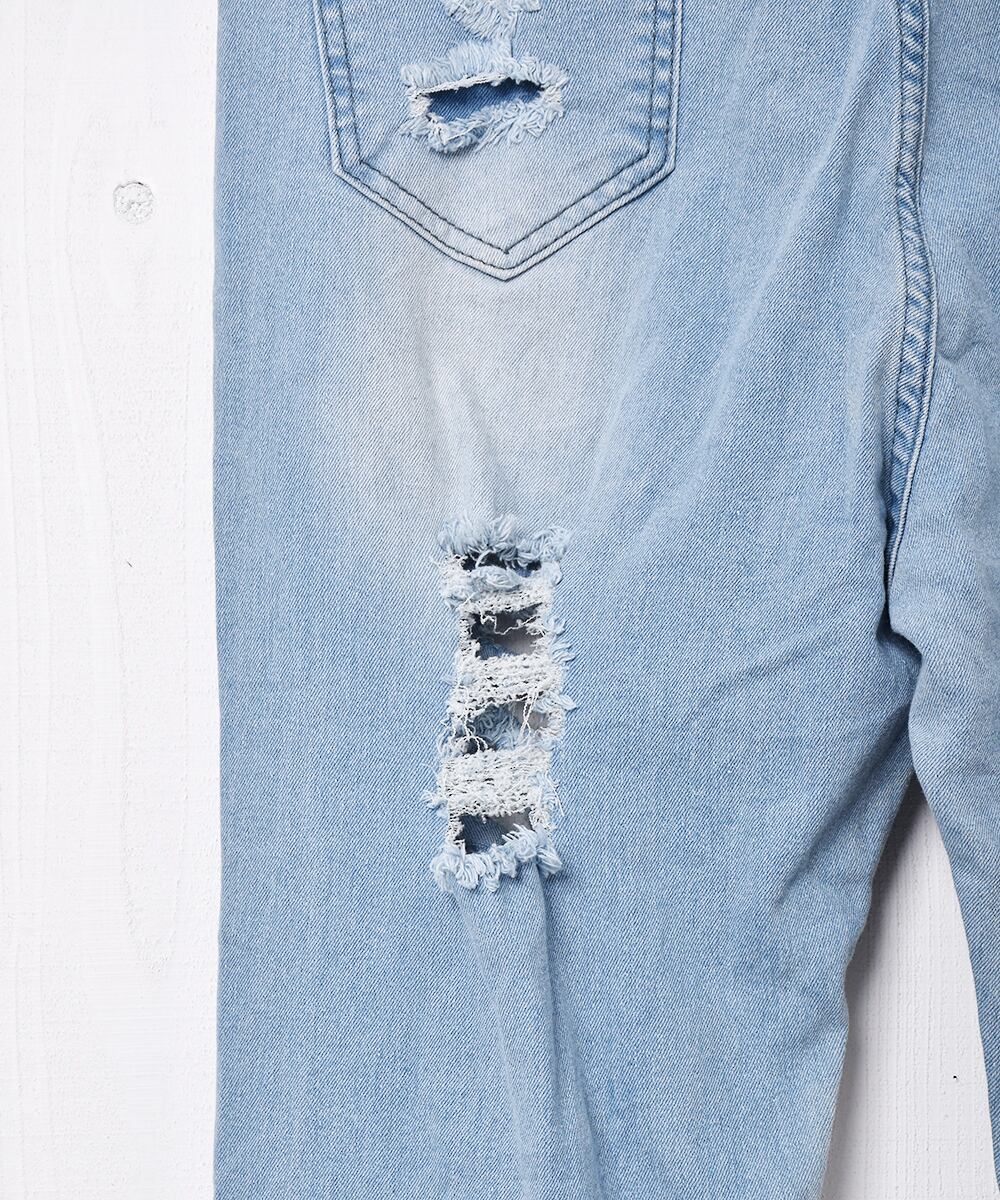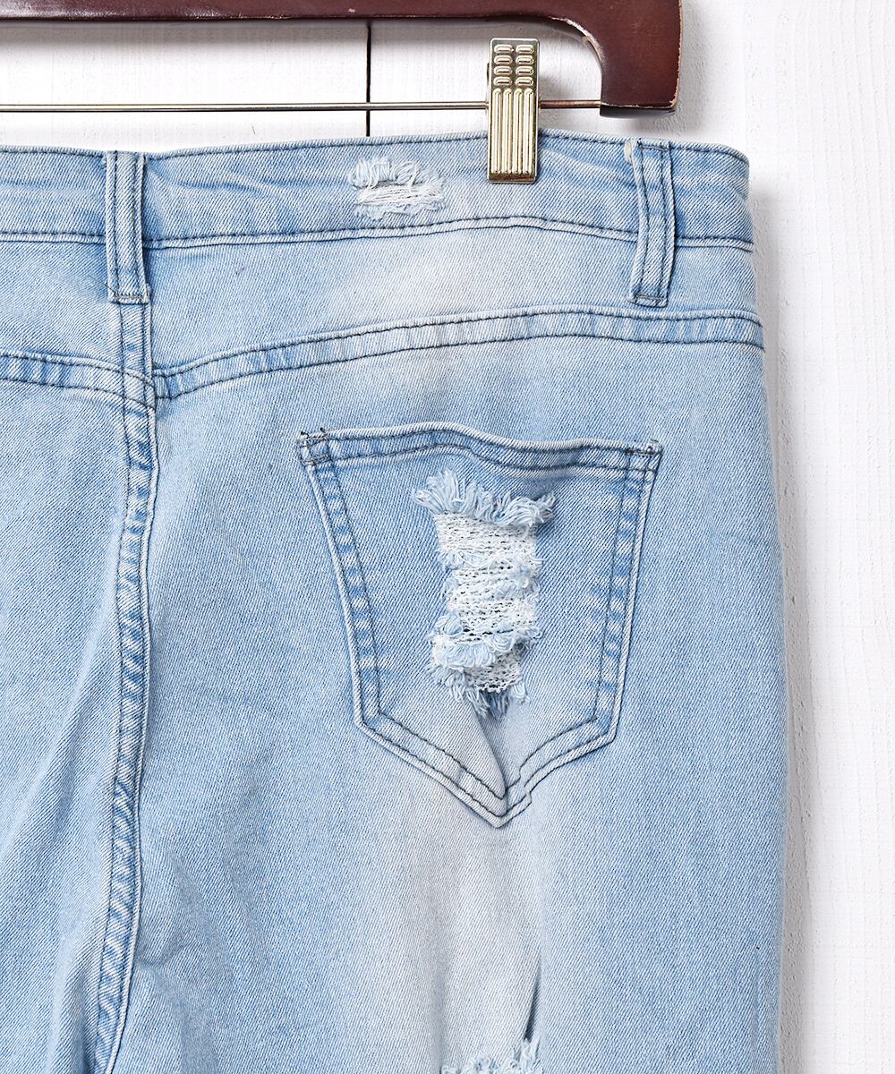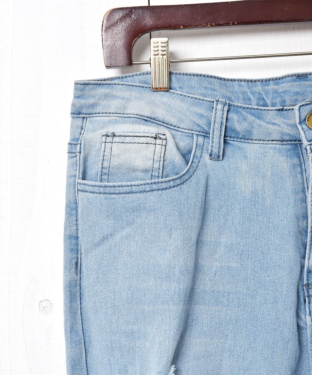 大胆なダメージ加工と裾のフリンジがインパクト抜群のデニムパンツ。フレアシルエットなので、スタイルよく着こなせる一着です。