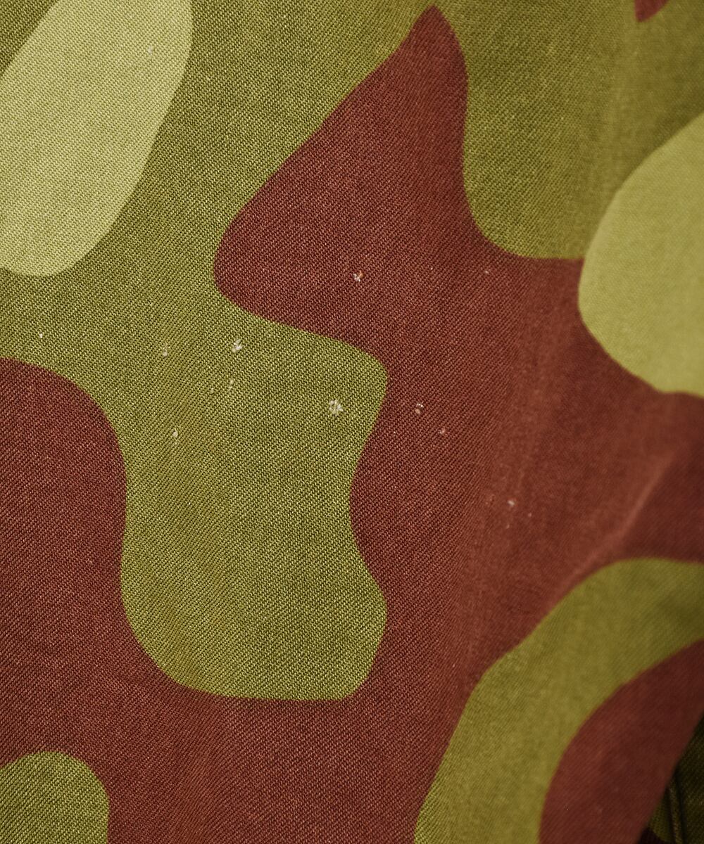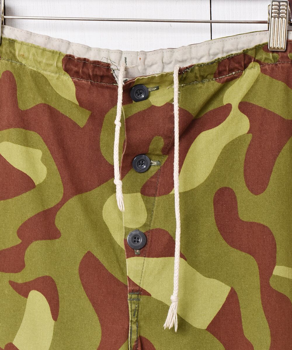 柔らかな雰囲気のカモ柄が特徴的なフィンランド軍のミリタリーパンツ。ポケットが貫通したオーバーパンツタイプで、かなり大きなウエストサイズが着こなしに面白みをプラスする一点。程よい厚みのしなやかな生地です。