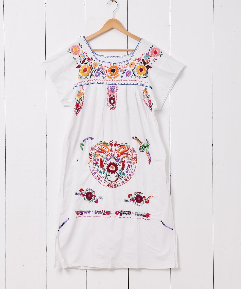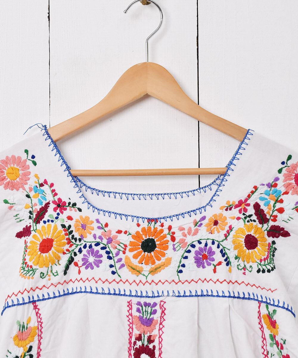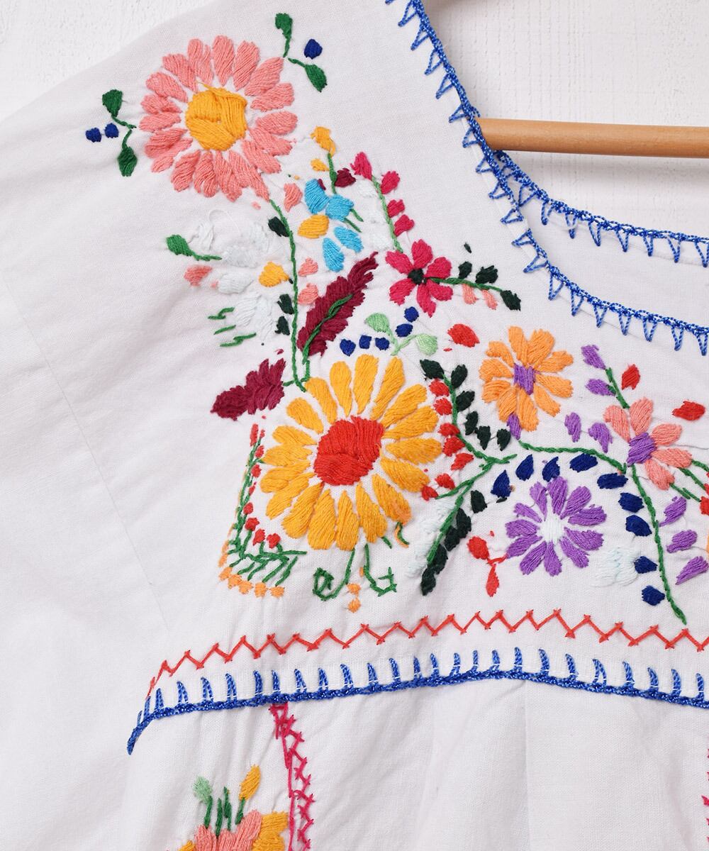 お花をモチーフにした、手の込んだ刺繍が目を惹くメキシカンワンピース。ゆったりとしたシルエットが魅力で、おそらくコットン素材のハリのある生地感です。