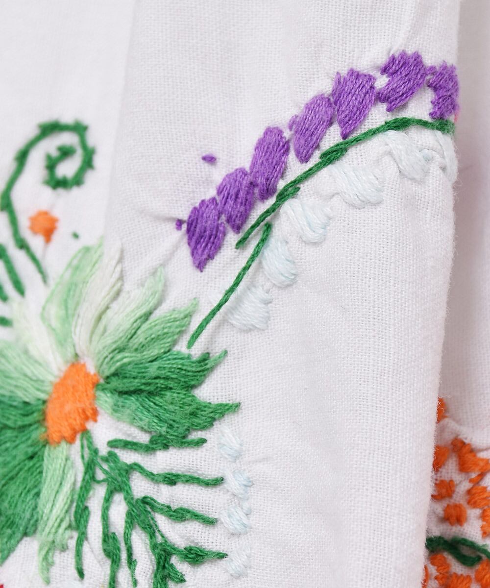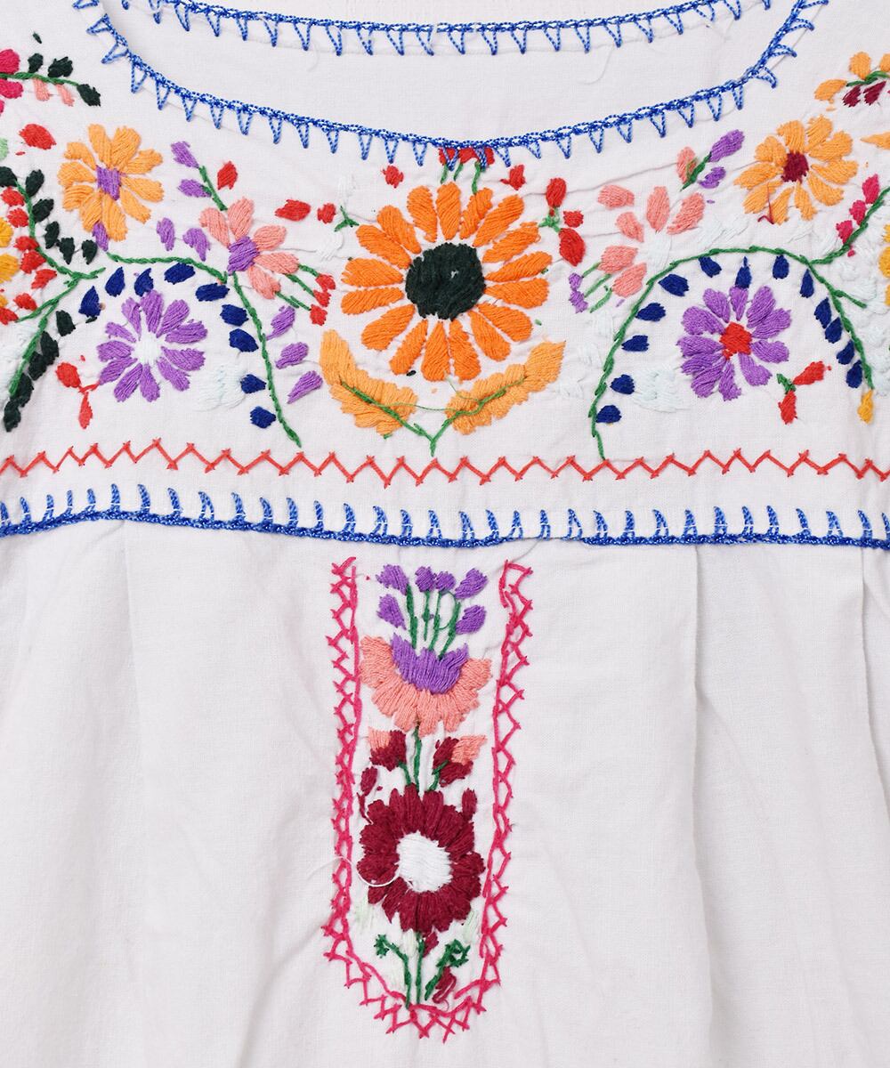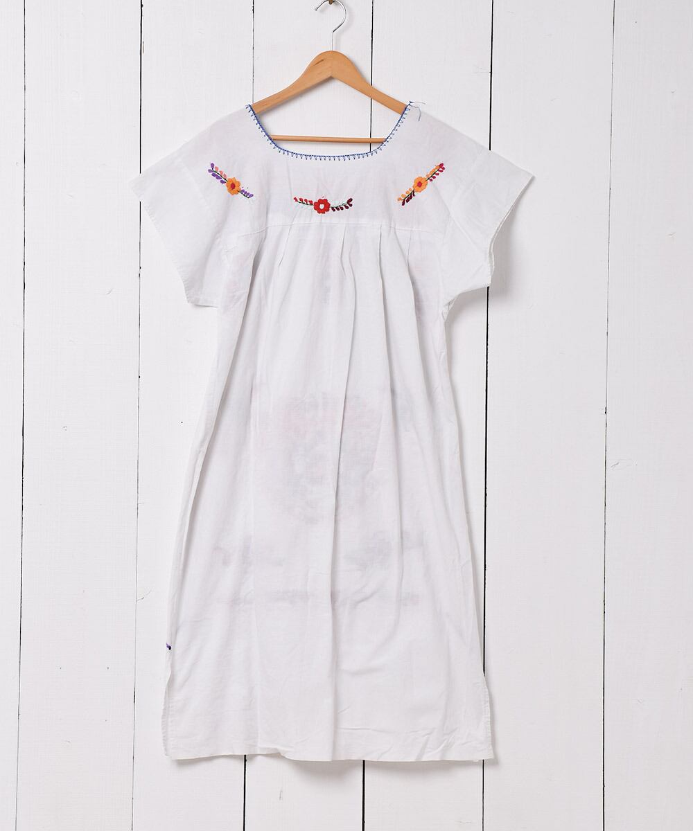 お花をモチーフにした、手の込んだ刺繍が目を惹くメキシカンワンピース。ゆったりとしたシルエットが魅力で、おそらくコットン素材のハリのある生地感です。
