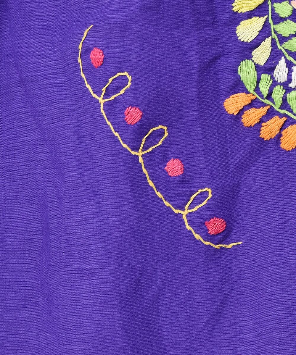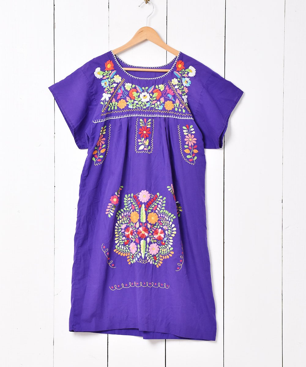 お花をモチーフにした、手の込んだ刺繍が目を惹くメキシカンワンピース。ゆったりとしたシルエットが魅力で、おそらくコットン素材のハリのある生地感です。