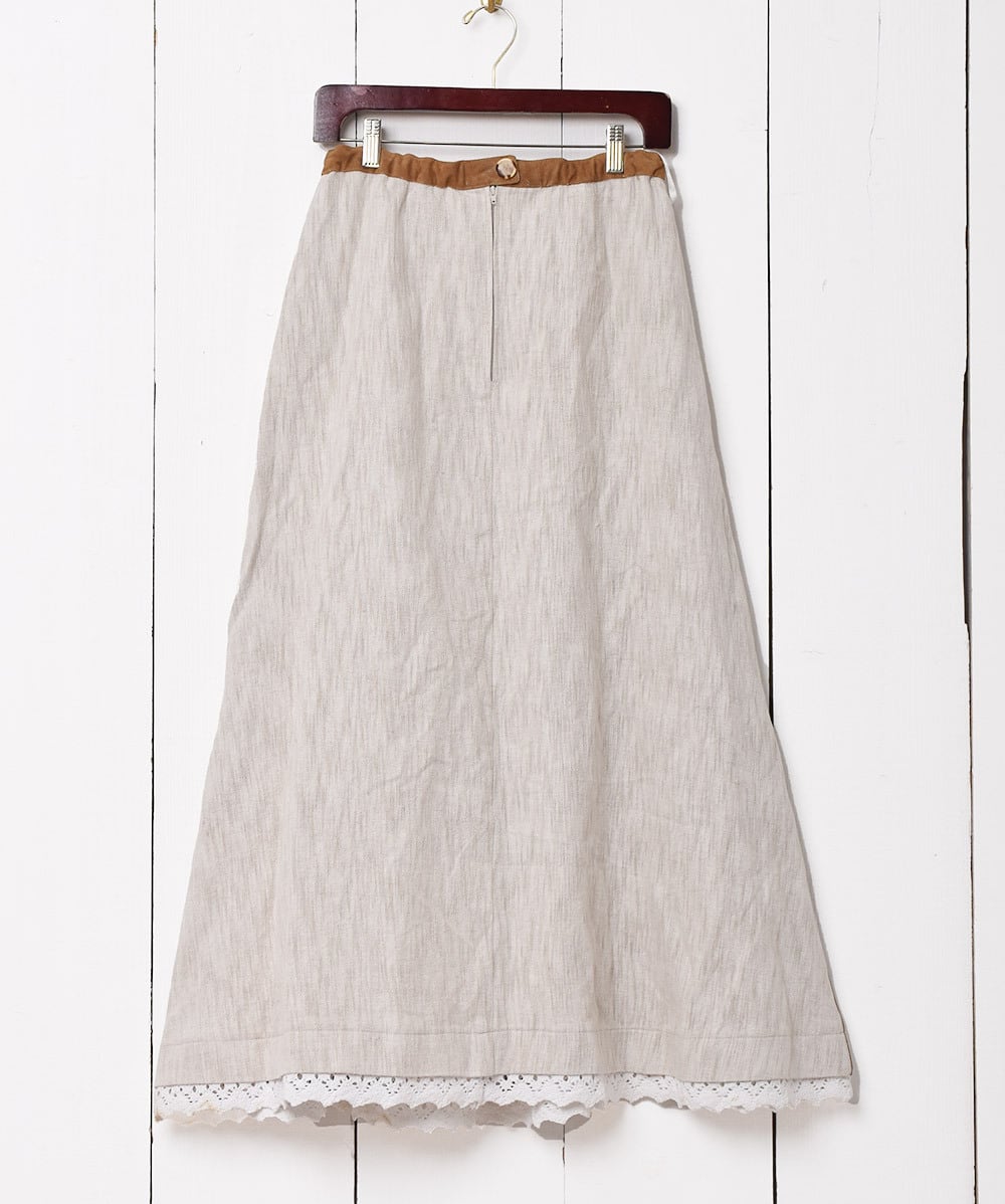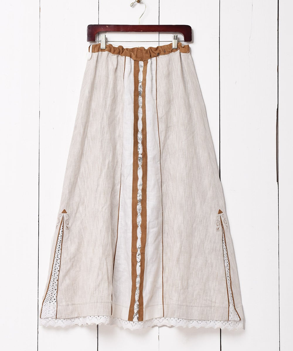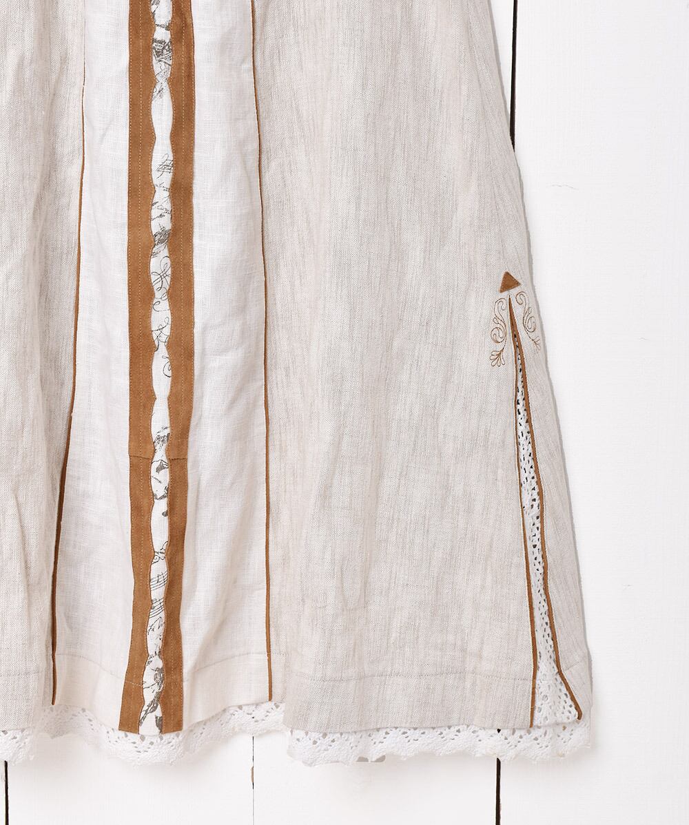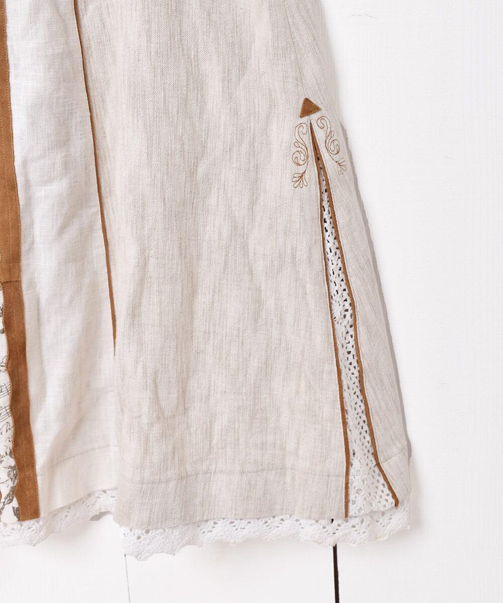 スリット部分にさりげなく施された刺繍が目を惹くチロリアン風スカート。裾のクロシェレースやリネン生地の風合いがヨーロッパらしいディテールの一着です。おそらくポリエステル素材の裏地付き。