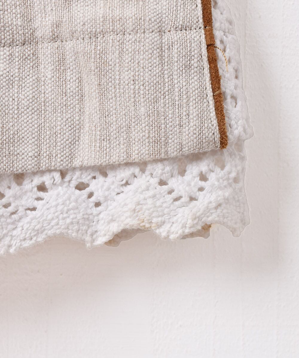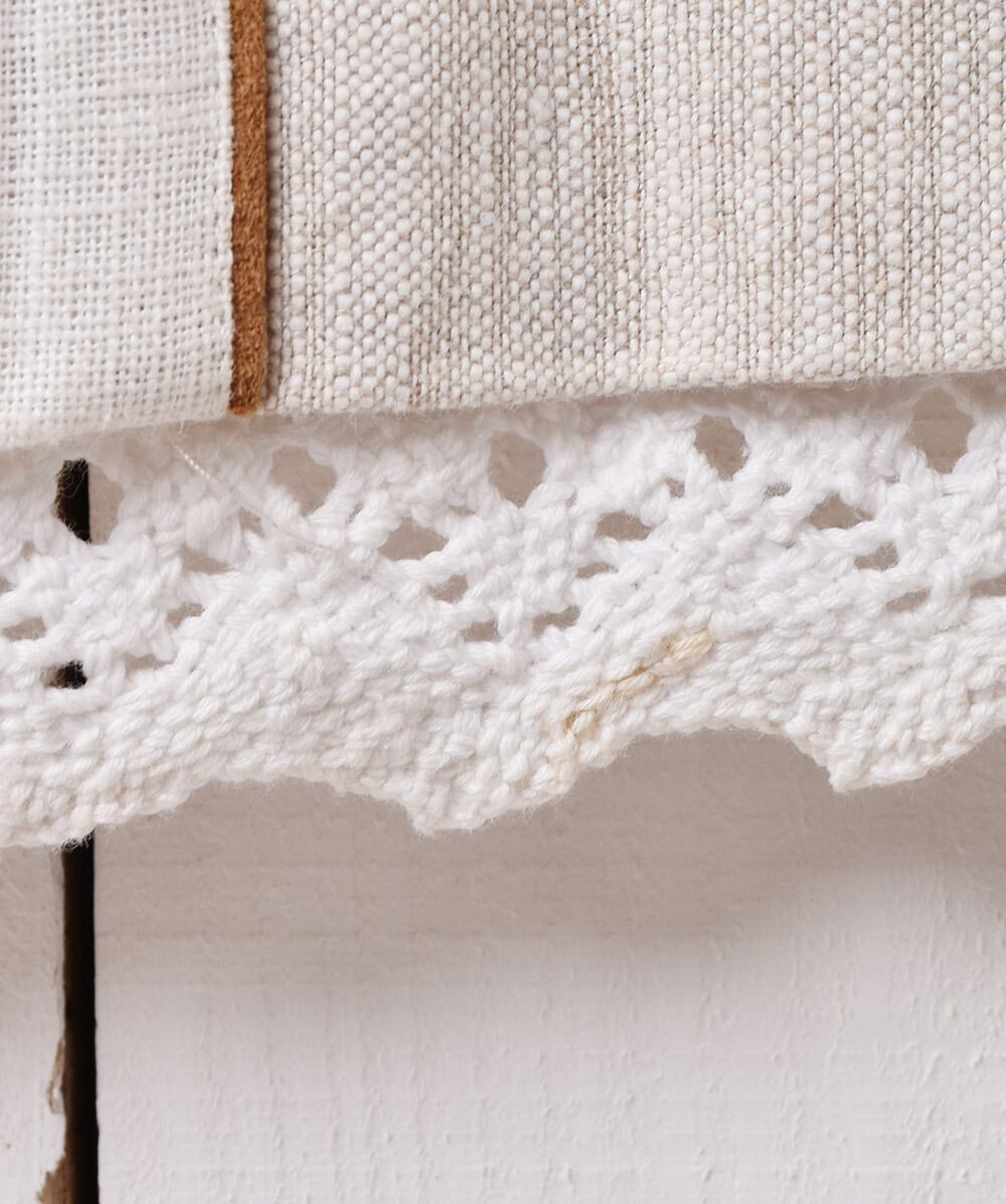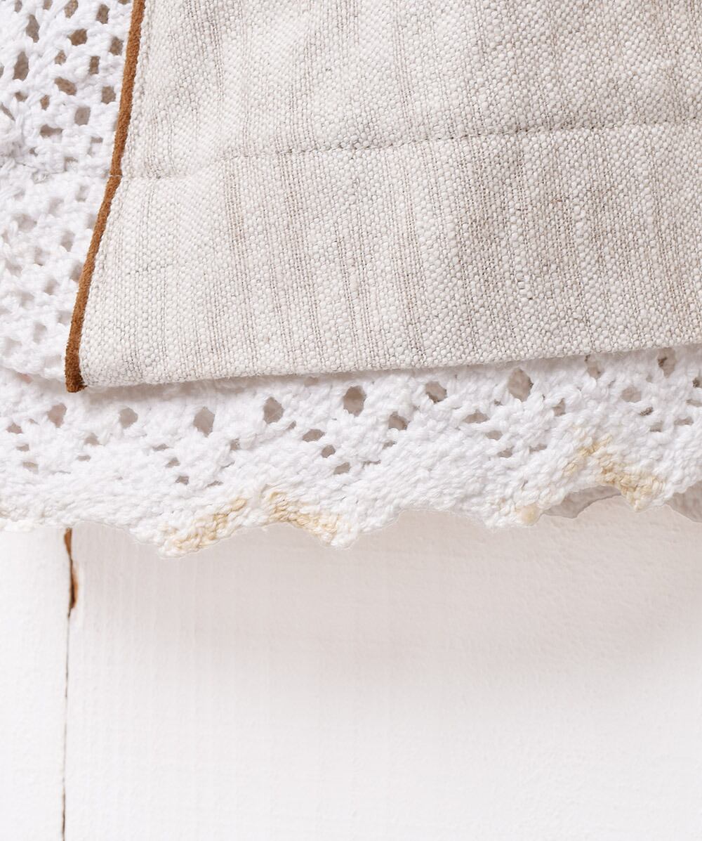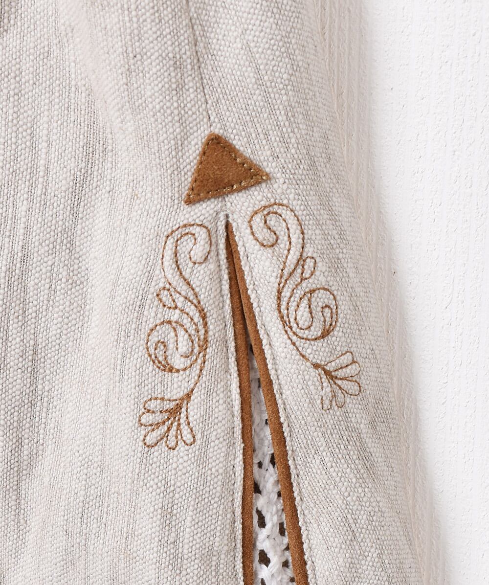 スリット部分にさりげなく施された刺繍が目を惹くチロリアン風スカート。裾のクロシェレースやリネン生地の風合いがヨーロッパらしいディテールの一着です。おそらくポリエステル素材の裏地付き。